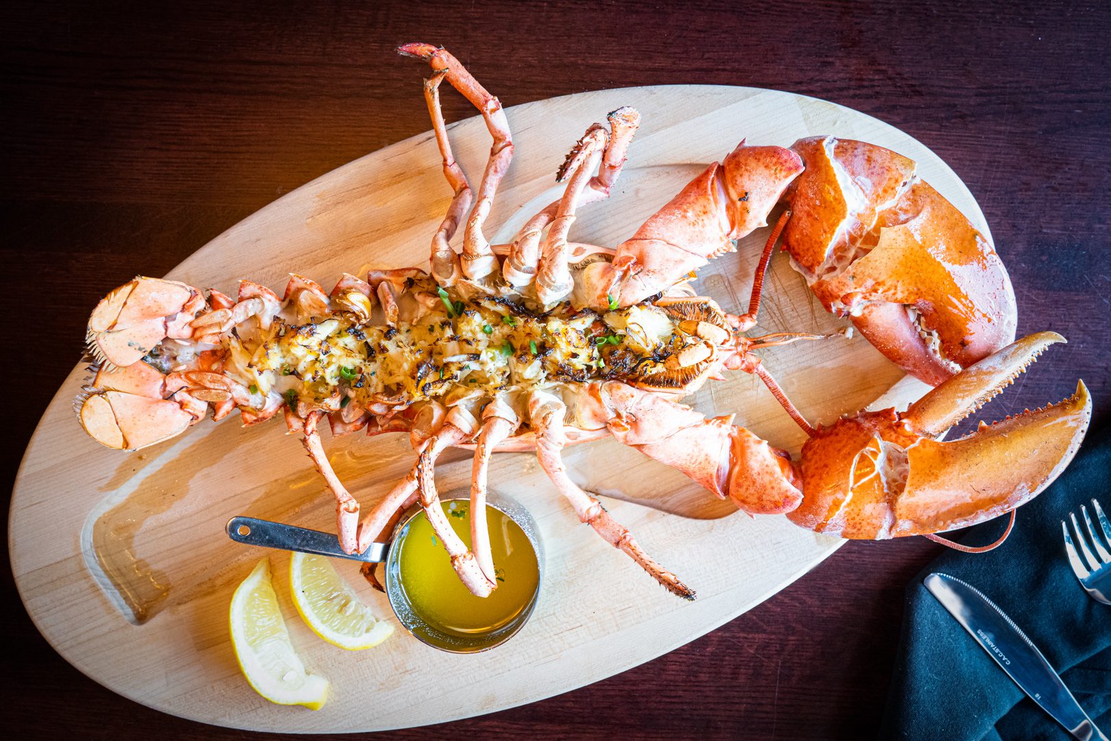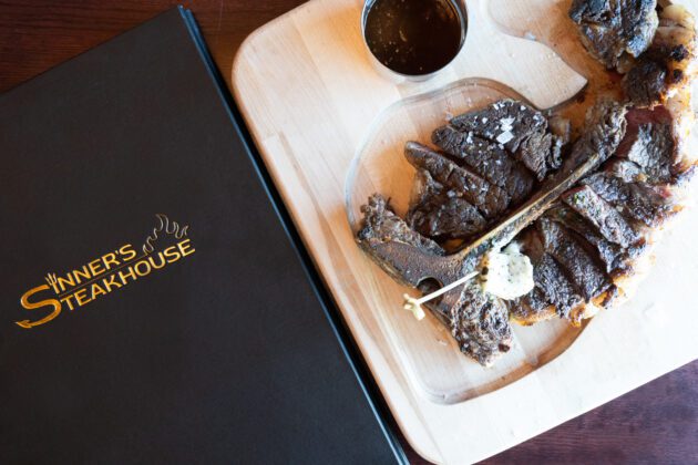 Popular menu items include Filet Mignon, Raw Bar options, and their French Onion Soup. Likewise, their tomahawk Ribeye for two, Big Sinner Burger, and Pork Chop Scarpariello are sinfully delicious.