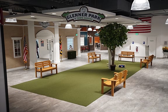 Town Square is an indoor, interactive senior center with 13 themed storefronts and experiences. These include a diner, movie theater, library, art studio, recreation room, vintage car garage, bocce court, newsstand, and garden center. In fact, the entire Square is arranged around an indoor central park, complete with benches and greenery.