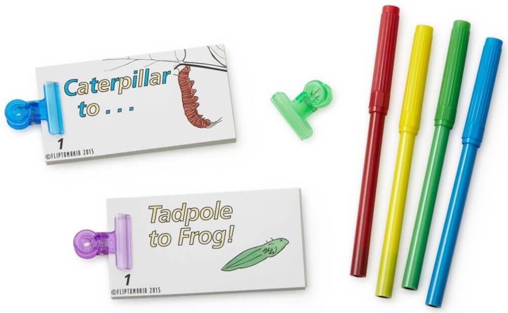 Description: The original way to view an animated story was via Flipbooks in the 1800s; they’re considered to be the very first movies. In fact, Thomas Edison (yes, the lightbulb dude!) helped create the very first Flipbooks and they’re still around today. These cute make-your-own flipbook kits contain 2 pre-drawn flipbooks, 1 blank flipbook for creating your own story, 4 markers and 3 clips. Choose from Butterfly/Frog, Rocket/Robot or T. Rex/Pteranodon.