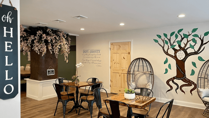 Defying Gravitea is a cafe that offers drinks, breakfast, lunch, and fresh-baked goods. The 1,775-square-foot space seats 49 guests indoors, and features their own proprietary tea line. The interior offers a “warm, comfortable environment,” according to Gina. “From custom river tables, cozy nooks, our Sakura tree, and a hand-painted mural ‘treebute’ to our supporters; it is really a space designed to welcome people in to relax and unwind.”