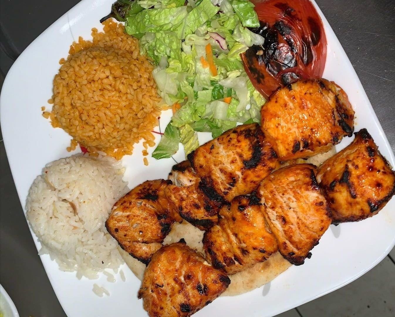 Meanwhile, hot appetizers at Hot Kebabs City include liver, fish sticks, and zucchini pancakes. If you’re looking for cold appetizers instead, try the eggplant salad or hummus. Entrees include chicken wings, the gyro kebab, or meat patties. Seafood dishes feature grilled branzino and grilled salmon. They also offer some sandwich options made from various kebabs and falafel. Finally, Mediterranean desserts like baklava, kunefe, or Turkish custard can round out your meal, as can their Turkish coffee.