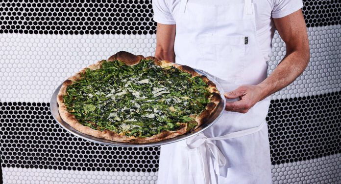 The pizzeria boasts bright colors, 30-foot ceilings, and a rainbow hallway. “Even the bathrooms have a kaleidoscope effect. It’s all meant to bring you back to your childhood; when going for a slice was a great night out before Neapolitan pizza became vogue,” Andrew says. “We are trying to bring you back.”