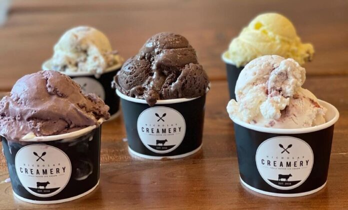 Nicholas Creamery works with local businesses to craft their ice cream. They make flavors using ingredients like acai, beer, ricotta, rum, bourbon, and coffee from small businesses in the area. “We do a lot of collaborations,” Jodie explains. “It’s really fun to work with local businesses. We love highlighting them.”