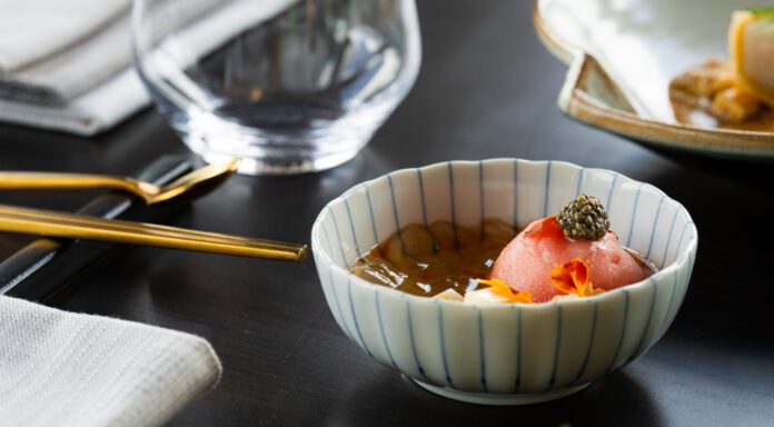 So far, popular dishes include the corn wontons in black tea broth with local basil. Patrons also enjoy the Hokkaido scallop tempura with crab roe sauce and tofu. However, Sean’s favorite menu item is the grilled black bass with fermented sweet rice glaze and crying tiger sauce.