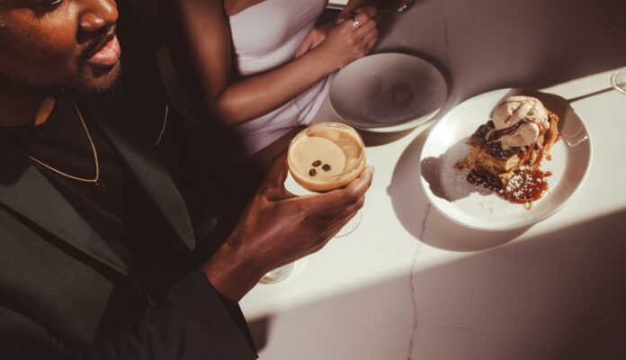 The atmosphere sets a relaxing vibe with high ceilings, light emitting windows, garage-style doors, and patio seating. Raw concrete, metal, elegant fixtures, and reclaimed materials offer patrons a respite for drinks, meals, or dessert.