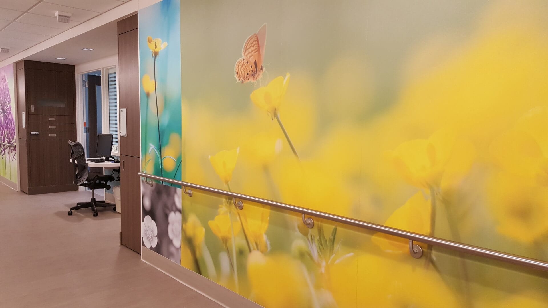 Even the small design details on the pavilion’s fifth-floor oncology unit have significant meaning. “The daffodil is the symbol of hope for cancer patients, so we decided to do a mural with a daffodil in the patient’s room. As you go onto the floor, we have peaceful murals of flowers in all different sizes and scale. Patients love it, and family members love it. You just don’t feel like you’re at a hospital,” shares Kirby.
