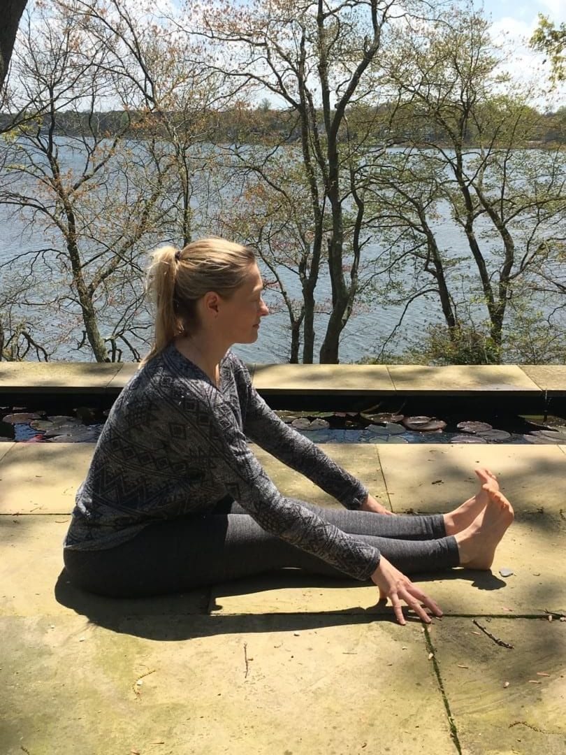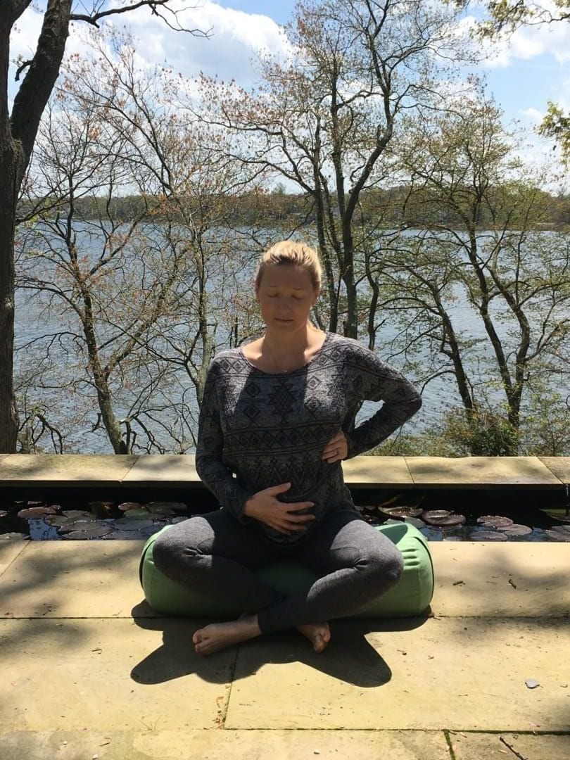 Sitting on a blanket, a bolster, or a cushion, close the eyes and begin to notice your natural spontaneous breath. Notice if the breath is shallow, deep, forced, or comfortable. Sit with this breath for a minute. Bring your hand to your belly, inhaling to five as you feel your belly expand like a balloon, then exhale to five as you feel your belly pull back towards your spine. Continue with this breath for a few minutes. Now bring your hand to the side of your ribs, focusing on bringing the inhale into the lungs as your ribs expand outward on the inhale (still to five) and hug into the mid-line during the exhale (still to five).
