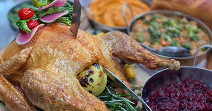 Details: There are plenty of great options on Stone House’s three-course prix-fixe Thanksgiving Day menu. Appetizer choices include roasted pumpkin soup, marinated beet salad, and calamari. Herb-roasted turkey, salmon, short rib, roasted cauliflower, and Cowboy ribeye round out the entrées. Traditional sides such as sausage stuffing, mashed potatoes, candied sweet potatoes, Brussels sprouts, and roasted carrots are served family-style. Dinner ends with a choice of bread pudding, pumpkin cheesecake, apple tarte tatin, or a taste of chocolate. Dinner requires a reservation, and costs $79 per adult and $30 per child).
