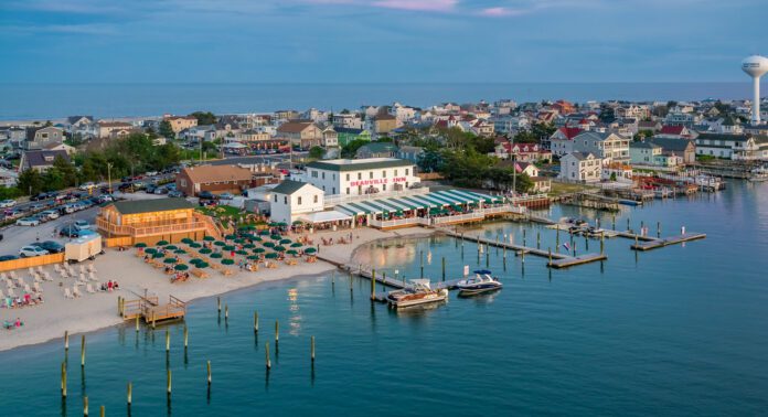 The property itself is massive, spanning from Bay Ave/Commonwealth Ave to Ludlam Bay and then Willard Ave. The main white “Deauville” building houses the Pub, Dining Room, Sunset Patio, and Package Goods store. First off, the Dining Room offers amazing views of Ludlam Bay and is ideal for date night. Then, the Pub features a stone fireplace and marble bar top, and is an ideal spot to watch sports. Meanwhile, the Package Goods shop offers Deauville Inn branded clothing, plus local beers, popular wines, and flavored seltzers.