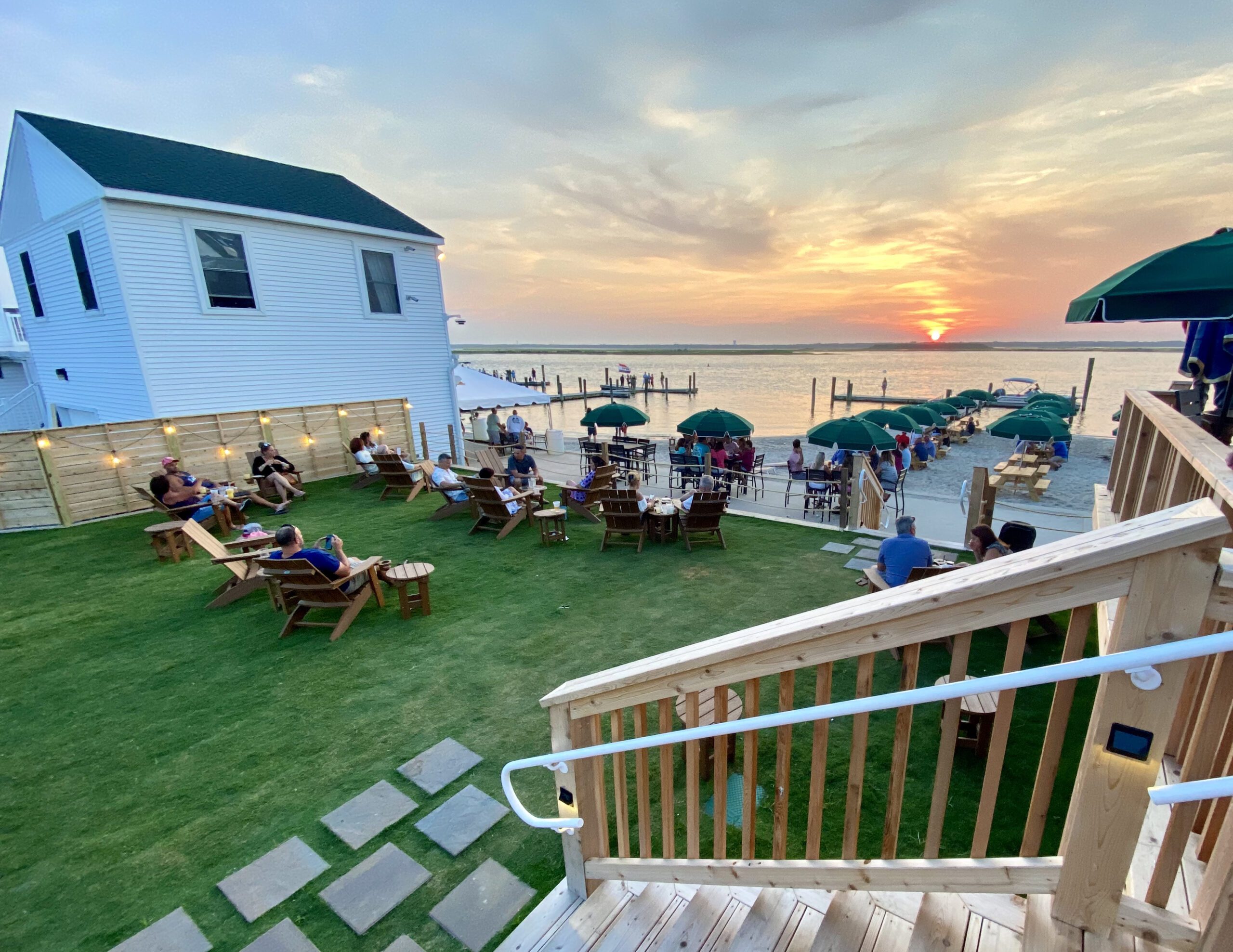 Next, to the north of the main building, is the Sand Bar. This elevated deck has a full kitchen, in addition to a five-station, full-service bar. (Which, of course, offers views of the beach and bay.) Next to the Sand Bar are the Beach and Lawn. This beach area allows kids to play in the sand while parents relax at a shaded picnic table. Similarly, the Lawn section is an elevated grassy area where guests can watch sunsets from Adirondack deck chairs. Beginning summer 2021, the Deauville inn will offer an “EZ docks” system. This will allow boaters to order and receive lunch without ever leaving their boat.